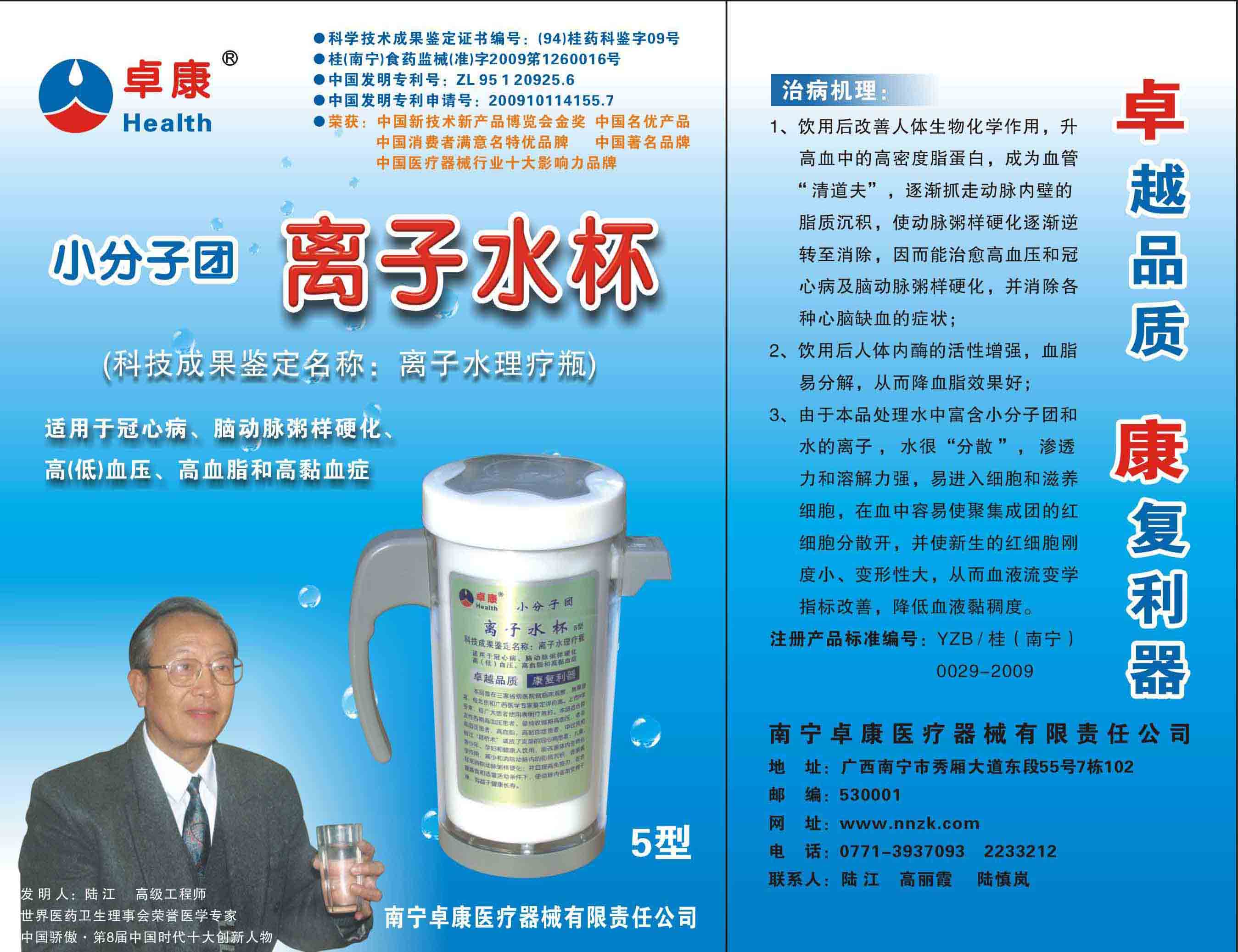 - -----南寧卓康微小水科技有限公司原為南寧卓康醫(yī)療器械有限責任公司 ,用戶普遍反饋高血壓患者飲用2—5個月,癥狀消除,不再服藥,治愈了高血壓; 冠心病患者,包括已做和未做支架或搭撟手術者,經3—5個月飲用,消除心痛、胸悶、早搏、房顫和心絞痛等癥狀,逆轉至消除動脈粥樣硬化和斑塊,一年左右治愈冠心病,心腦電圖正常,經冠脈造影掃描無明顯狹窄,表明冠心病痊愈;糖尿病人飲用3-10個月,血糖尿糖正常,治愈2型糖尿病; 并且使前列腺增生、低血壓、腦萎慢性咽喉炎、慢性氣管炎、支氣管炎、哮喘、矽肺病、甲亢、慢性胃腸炎、膽囊炎、慢性腎炎、腎衰、風濕性關節(jié)炎、痔瘡和濕疹皮炎及中風癱瘓或偏癱失語后遺癥等不藥而愈,且多病同治,無需終生服藥,彌補了幾千年來藥物的欠缺,使“微小水”成為人類消除高血壓、冠心病和糖尿病的寶貴資源。腦動脈粥樣硬化、低血壓和前列腺增生患者,一般飲用四個月痊愈;中風后遺癥患者,一般飲用8個月痊愈。請詳閱《用戶反饋》欄目中大量患者的反饋信、檢測報告,有的還附照片。產品屢獲大獎,論文也屢獲一等獎。廣大用戶好評不斷,有口皆碑。